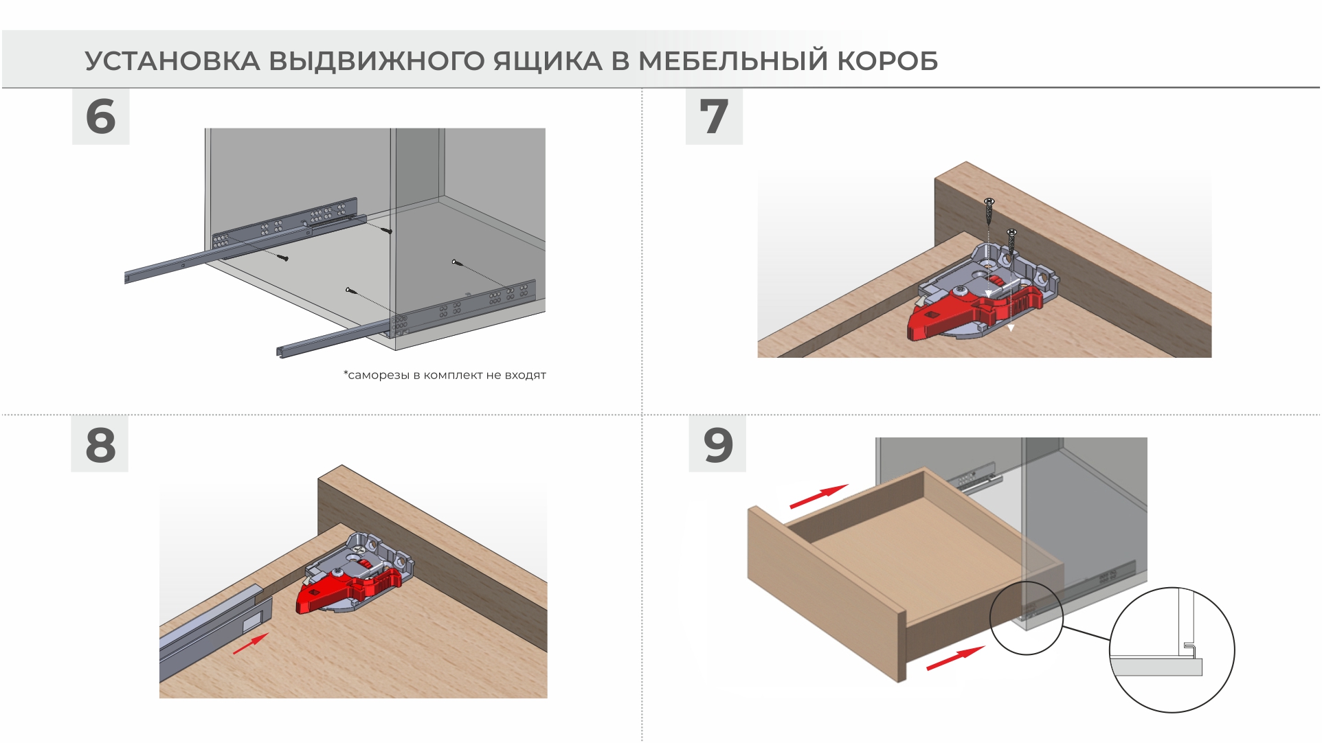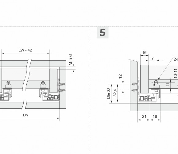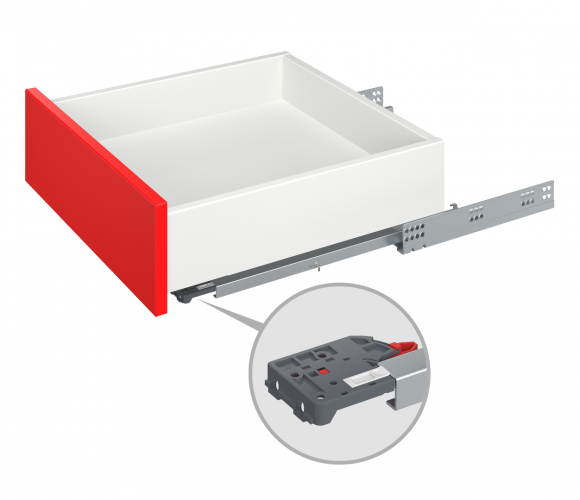 В направляющих предусмотрены дополнительные металлические упоры на подвижной и неподвижной частях направляющих для сдерживания давления в момент установки и в процессе эксплуатации. Это снижает риски излома механизма PUSH, а также избавляет от необходимости создания дополнительных упоров при создании выдвижных ящиков с вкладным типом фасадов.