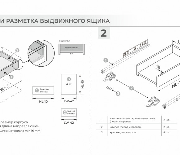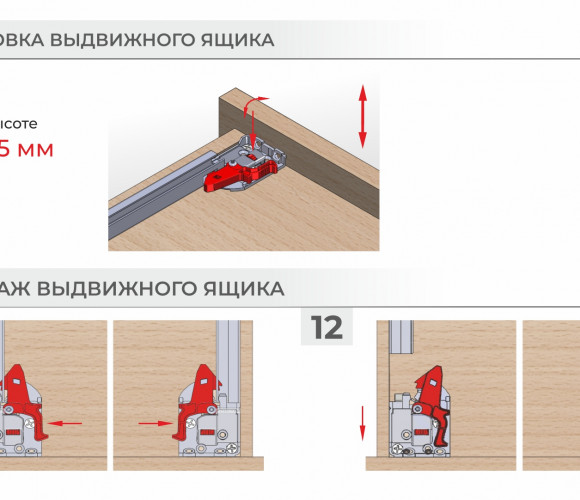 В направляющих предусмотрены дополнительные металлические упоры на подвижной и неподвижной частях направляющих для сдерживания давления в момент установки и в процессе эксплуатации. Это снижает риски излома механизма PUSH, а также избавляет от необходимости создания дополнительных упоров при создании выдвижных ящиков с вкладным типом фасадов.