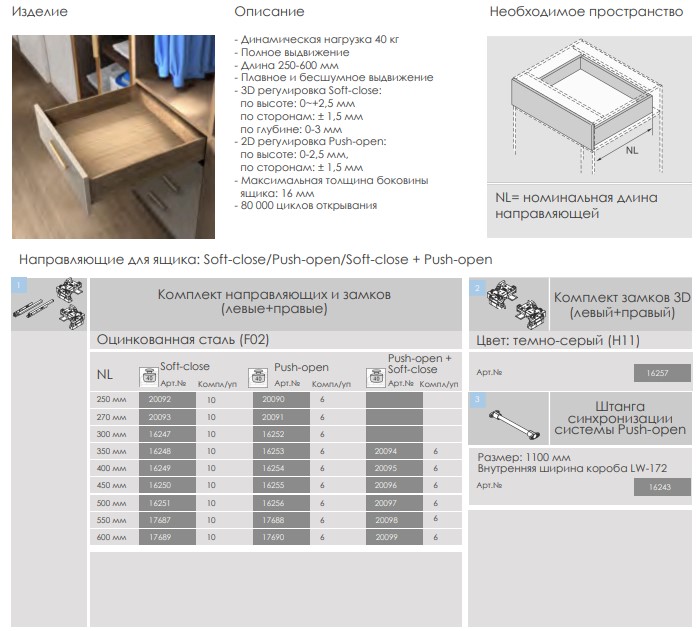 Направляющие скрыт. монт. DTC TS10/350 40кг 3D, полного выдв. с дов. (TS10350H) 0016248