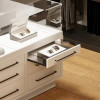 Стеклянные боковины ящиков добавляют интерьеру необычный выразительный элемент.