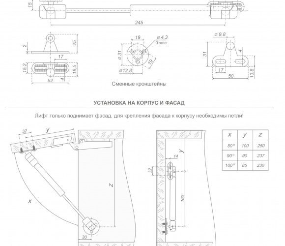 Лифт газовый (газовая пружина) для корпусной мебели. Сменный кронштейн под 32 мм и 16 мм. Кронштейны двух видов: для установки на фасады из массива дерева или ДСП и металлические рамы.