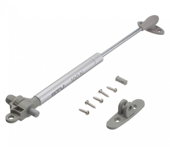 Подъёмник газовый с амортизатором 60N GTV, серый - мебельный подъемник, в конструкции которого предусмотрены доводчик и амортизатор. При правильной регулировке газлифта, в момент закрывании фасада исключается удар и сопутствующий ему шум.