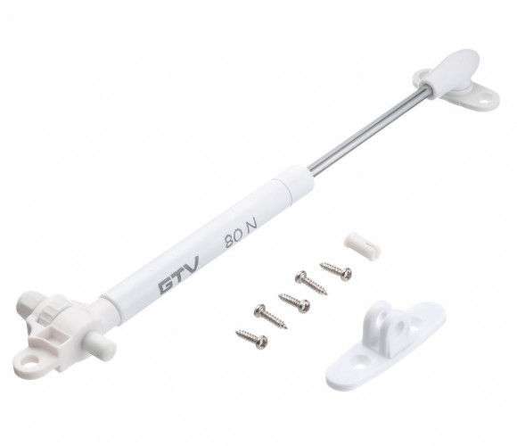 Подъёмник газовый с амортизатором 80N GTV, белый - мебельный подъемник, в конструкции которого предусмотрены доводчик и амортизатор. При правильной регулировке газлифта, в момент закрывании фасада исключается удар и сопутствующий ему шум.