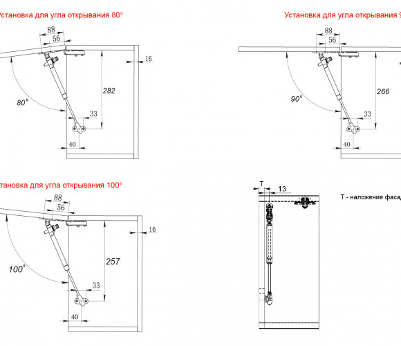 Газовый лифт поставляется в комплекте с шаблоном-инструкцией для установки, которая поможет легко и быстро произвести монтаж, а также и выбрать угол открывания фасада 80°, 90° или 100°.