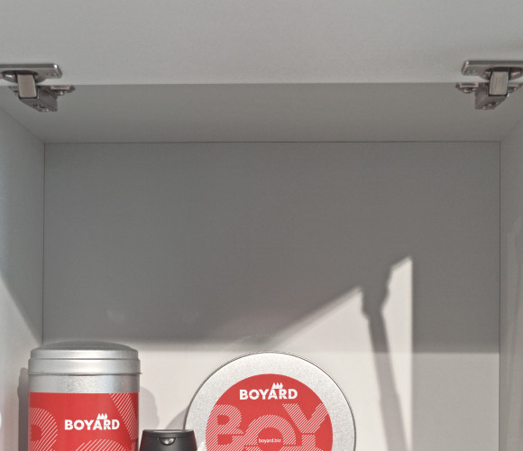 Лаконичный моно-дизайн, образуемый защитно-декоративным стальным чехлом, скрывает спицу газлифта. Белый цвет подходит большинству кухонь и хорошо сочетается с боковинами ящиков аналогичного цвета.
