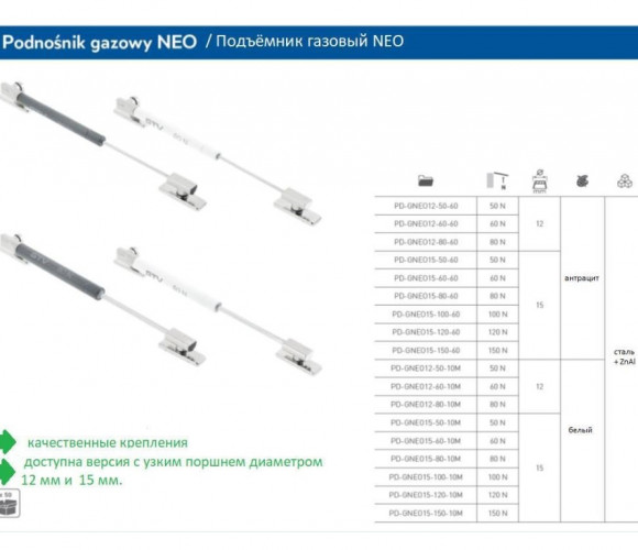 Подъемник газовый NEO 5 кг для фасадов, диаметр 12 мм, антрацит - мебельный механизм, используемый для открывания фасада. Работает за счет инертного газа, находящегося в цилиндре, и поршня. Один подъемник рассчитан на вес, обозначенный в наименовании товара.В качестве основного параметра газлифта также может быть указана сила сжатия, измеряемая в Ньютонах (N). 1 кг примерно соответствует 10N. Для комфортной и долговечной эксплуатации рекомендуется устанавливать два газлифта на один фасад.