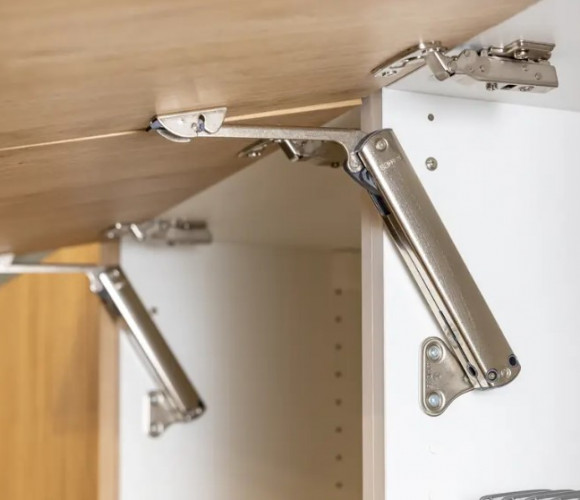 Механизм подъемный Slim Месн — функциональная мебельная фурнитура, используемая для поднятия крышки стола, полки или двери и ее фиксации в открытом положении. Силовой механизм В1 выдерживает весовую нагрузку до 12 кг. Устанавливается на петли с доводчиком, что способствует плавному и тихому закрытию