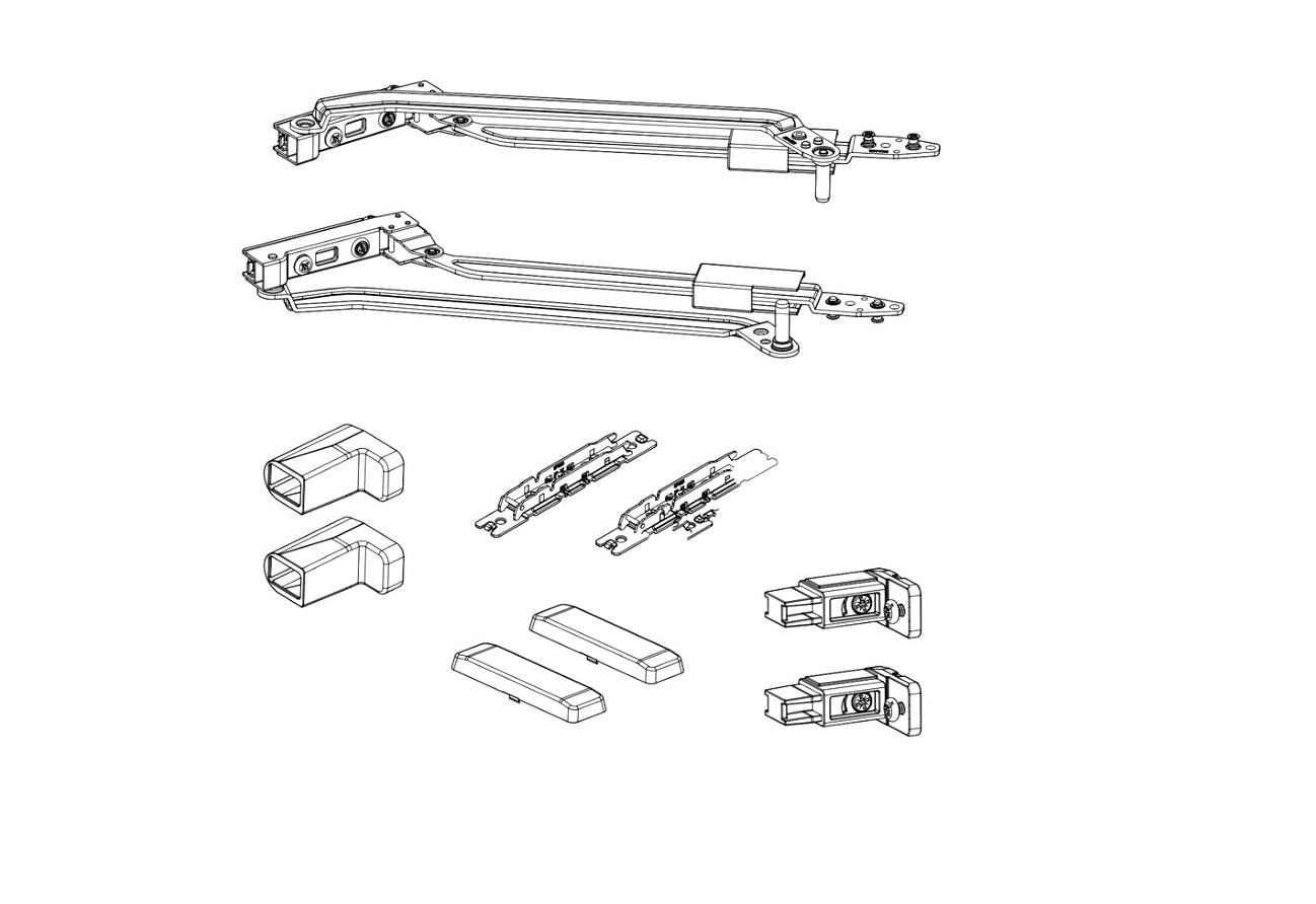 Комплект из: - двух рычагов (левый + правый) - двух креплений для штанги - двух заглушек креплений штанги - двух креплений рычагов к фасаду - двух заглушек для креплений рычагов к фасаду Обязательно дополнительно приобретается: - Подъемный механизм нужной нагрузки - Штанга синхронизации нужной длины