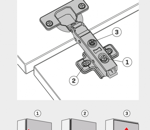- Регулировка верхнего фасада: по высоте (+/-2 мм) – по ширине (+/-2 мм) – по глубине (+/-2 мм)