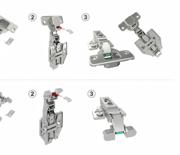 LIMIT H87 размещается через специальный паз как с обратной стороны (для петель H89002, H845, H801 (A|B|C), H813, H741, H742, H641, H642, H305 (A|B|C), H306 (A|B|C), H301 (A|B|C)), так и с лицевой стороны (для петель H319 (A|B|C)) чашки петли: на верхнюю ось скобы между седлом и серьгой. При необходимости аксессуар можно демонтировать.