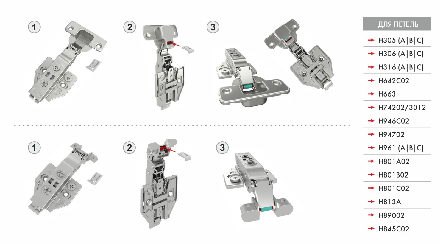 Ограничитель LIMIT H87 невозможно установить в модели петель H740, Н640 ввиду особенностей конструкции петель.
