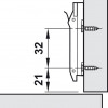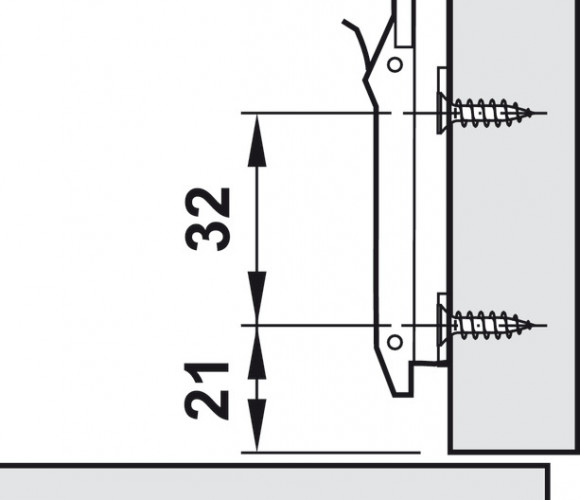 Никелированная линейная монтажная планка для петель Hafele Duomatic, регулируемая по вертикали до 2,8 мм. Монтаж планки осуществляется с помощью саморезов диаметром 4 мм. Сцепка с четырехшарнирной петлей происходит путем защелкивания.