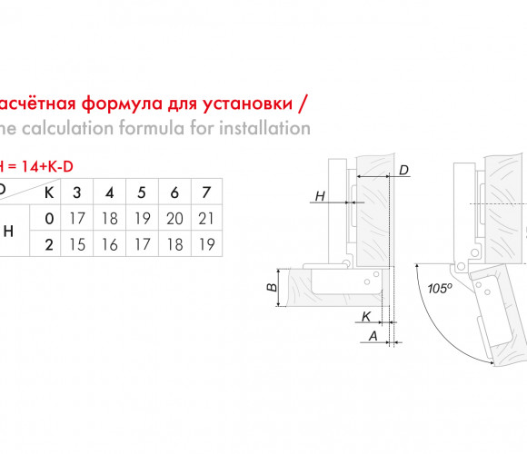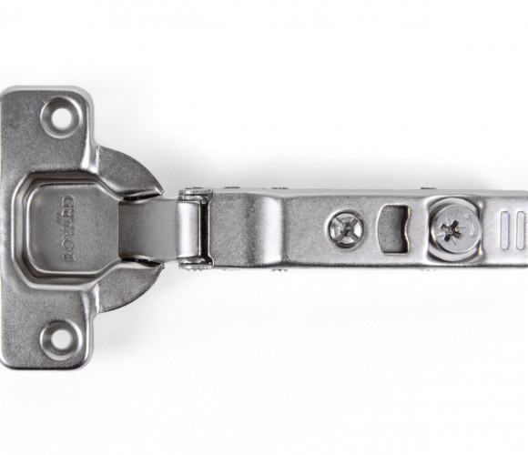 Модель имеет регулировку фасада в трёх плоскостях (по глубине, горизонтали и вертикали). Удобная регулировка по высоте и глубине в одно действие осуществляется при помощи эксцентрикового винта, встроенного в корпус петли. Регулировка фасада по горизонтали доступна при помощи винтов на планке.