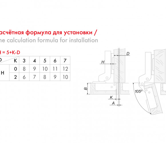 Модель имеет регулировку фасада в трёх плоскостях (по глубине, горизонтали и вертикали). Удобная регулировка по высоте и глубине в одно действие осуществляется при помощи эксцентрикового винта, встроенного в корпус петли. Регулировка фасада по горизонтали доступна при помощи винтов на планке.