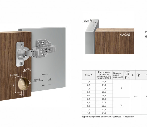 Модель можно укомплектовать разными видами планок: трапециевидной формы, с высотой 0 или 2 мм, с вкрученными евровинтами или с креплением на саморезы, а также декоративными заглушками на чашку и на тело петли и ограничителем угла открывания LIMIT H87. Планки и аксессуары приобретаются отдельно.