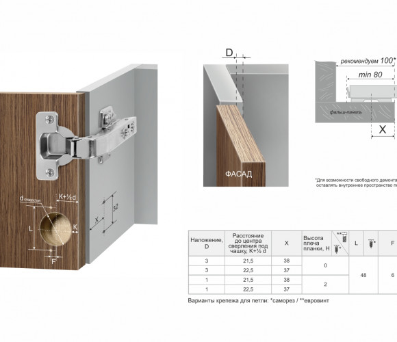 Модель можно укомплектовать разными видами планок: трапециевидной формы, с высотой 0 или 2 мм, с вкрученными евровинтами или с креплением на саморезы, а также декоративными заглушками на чашку и на тело петли и ограничителем угла открывания LIMIT H87. Планки и аксессуары приобретаются отдельно.