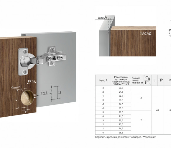 Как и другие представители линейки NEO модель Н319 является конструктором: ответные планки к петле подбираются исходя из индивидуальных монтажных значений. Для Н319 созданы две монтажные планки разной высоты — Н5912 и Н5914. Они индивидуальны для петли EXTRA Н319 и не подходят к другим моделям линейки NEO. Монтажные планки Н5912 и Н5914 приобретаются отдельно исходя из толщины фасада и боковины корпуса, значения «К» (расстояние до чашки) и ряда других параметров, которые высчитываются по формулам для петель типа А, В и С (формулы размещены в карточке товара).