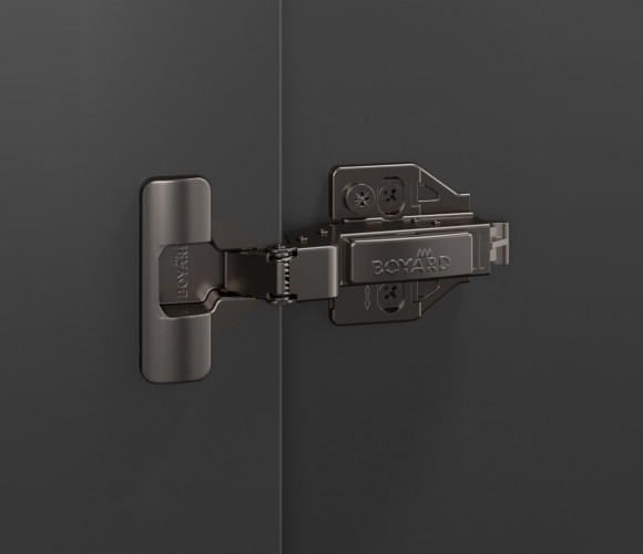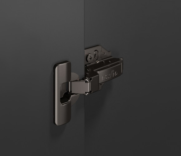SYSTEM H801 — прогрессивная петля из линейки EVO с углом установки 90°, амортизацией и 3D-регулировкой для фасадов толщиной до 28 мм.