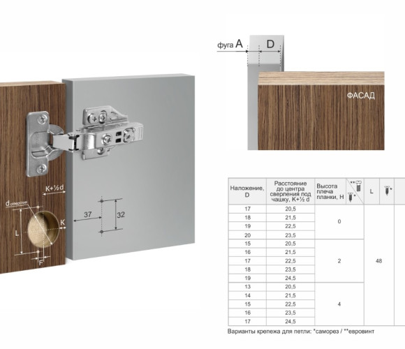Модель можно укомплектовать разными видами эксцентриковых планок трапециевидной формы: с высотой 0 или 2 мм, с вкрученными евровинтами или с креплением на саморезы, а также декоративными заглушками на чашку и на тело петли и ограничителем угла открывания LIMIT H87. Планки и аксессуары приобретаются отдельно.