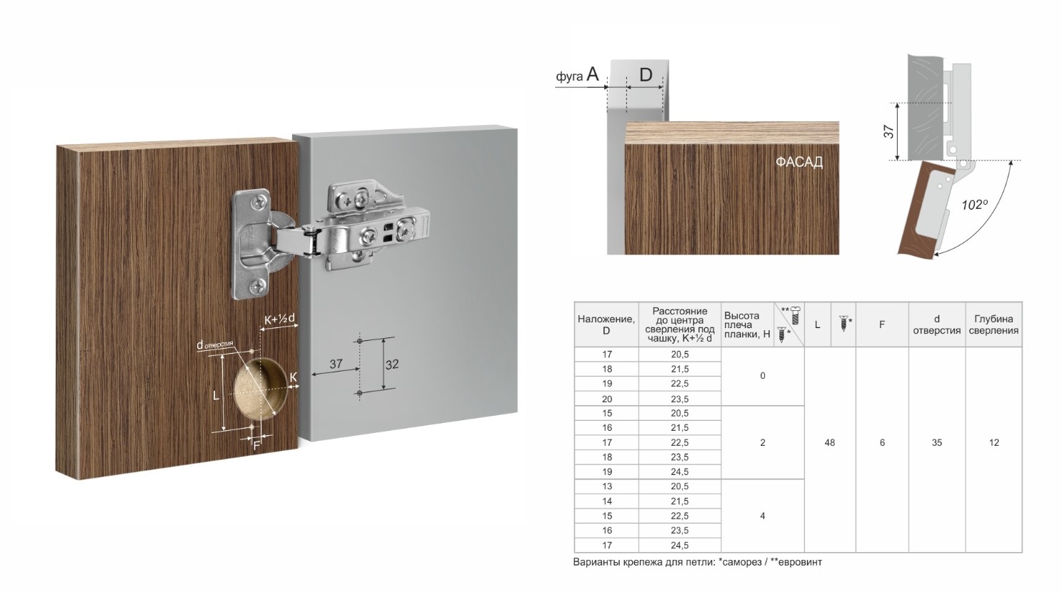 Суммарная 3D-регулировка, стрелки на теле петли и регулировочный винт с ограничителем обеспечат оперативный и корректный монтаж без рисков поломки амортизатора. Регулировка по вертикали осуществляется при помощи эксцентрикового винта в корпусе ответных планок.