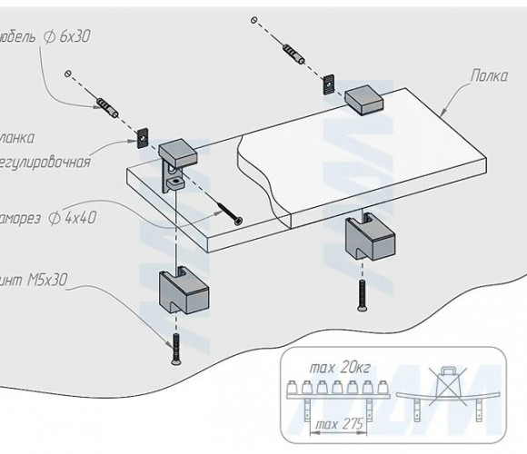 Комплектация: менсолодержатель — 1 шт., саморез 4×40 мм — 1 шт., дюбель 6×30 мм — 1 шт., планка регулировочная — 1 шт.