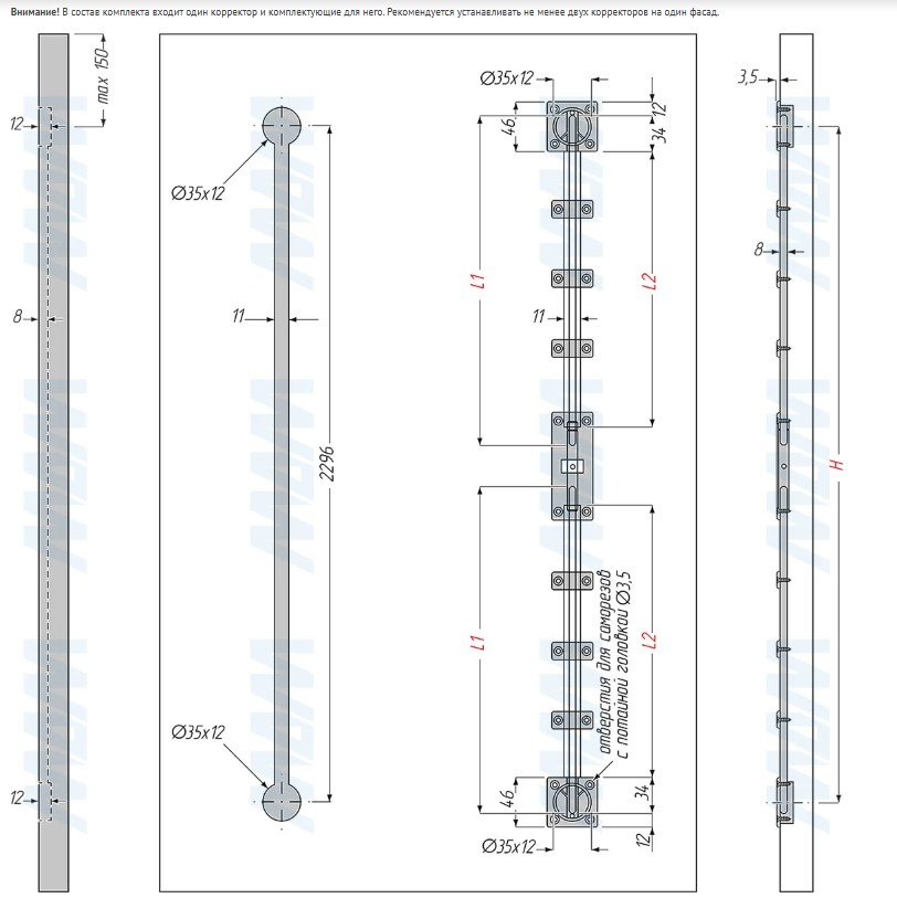 Внимание! В состав комплекта входит один корректор и комплектующие для него. Рекомендуется устанавливать не менее двух корректоров на один фасад.