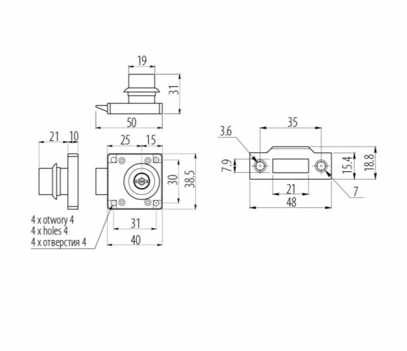 Функция автоматического запирания. При закрытии двери/задвижении ящика срабатывает защелка, обеспечивая запирание без использования ключа.