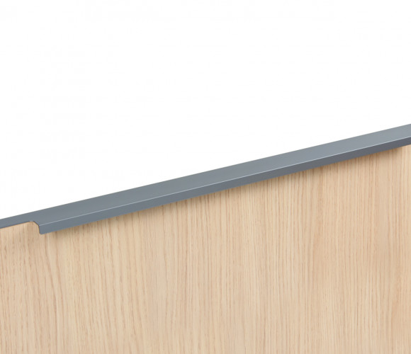 Ручка имеет богатую палитру цветовых решений и разнообразие длин. Данная модель допускает размещение двумя способами — «в размер» фасада и по центру широких фасадов (как большой «язычок»).