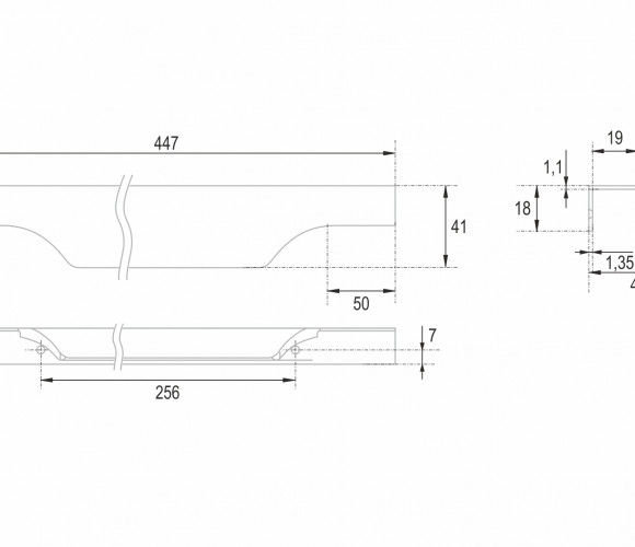 WING RT114 допускает размещение двумя способами — «в размер» фасада (актуально для размеров 500-900 мм) и по центру широких фасадов, как большой «язычок» (для размеров 150 мм, 200-400 мм, 450 мм).