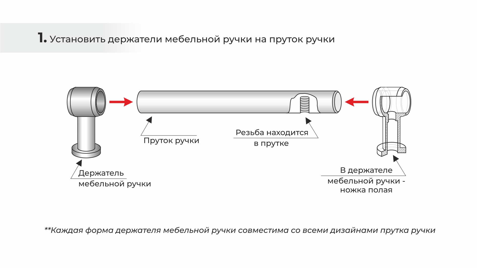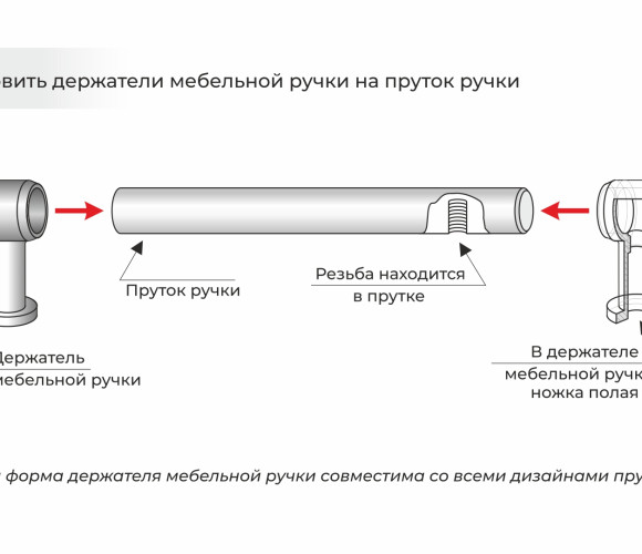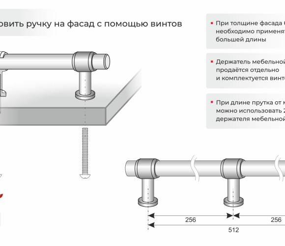 Прутки поставляются без крепежа и без держателей. Держатели для прутка мебельной ручки подбираются производителем мебели самостоятельно и предлагаются в комплекте с крепежом. Пруток не может быть прикреплен к фасаду без использования держателей-ножек.