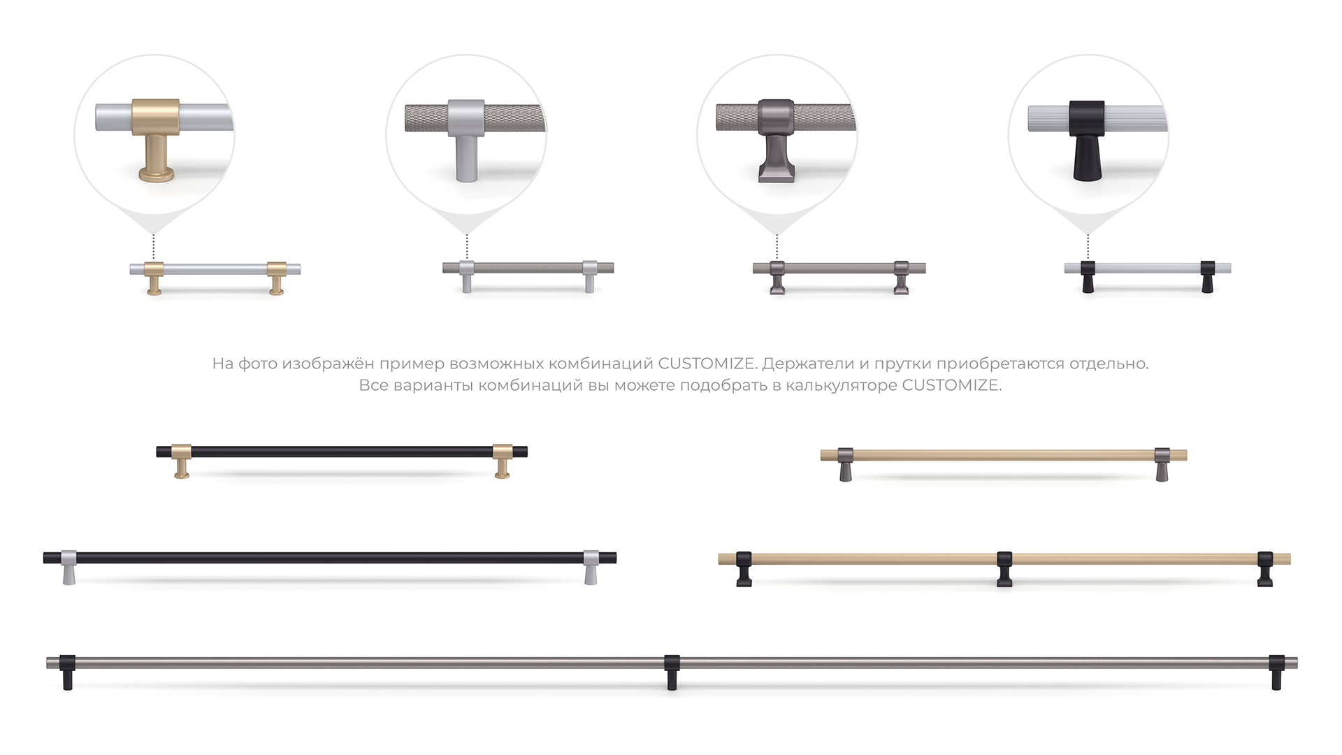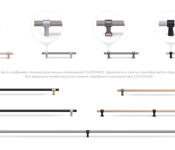 CUSTOMIZE – это серия кастомных ручек, которые клиент создает сам под свой авторский мебельный проект. 4 дизайна держателя мебельной ручки, 3 дизайна прутка, множество длин, трендовые оттенки – всё это открывает огромный простор для стильных творческих экспериментов.