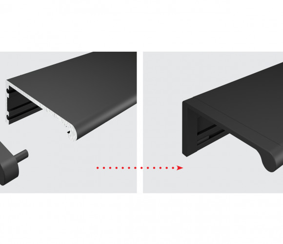 Профильная ручка RP101 — хит на рынке лицевой фурнитуры. Она монтируется на торец фасада методом наложения и не требует дополнительной фрезеровки. В теле ручки предусмотрены пазы для установки металлических заглушек RZ101.01.