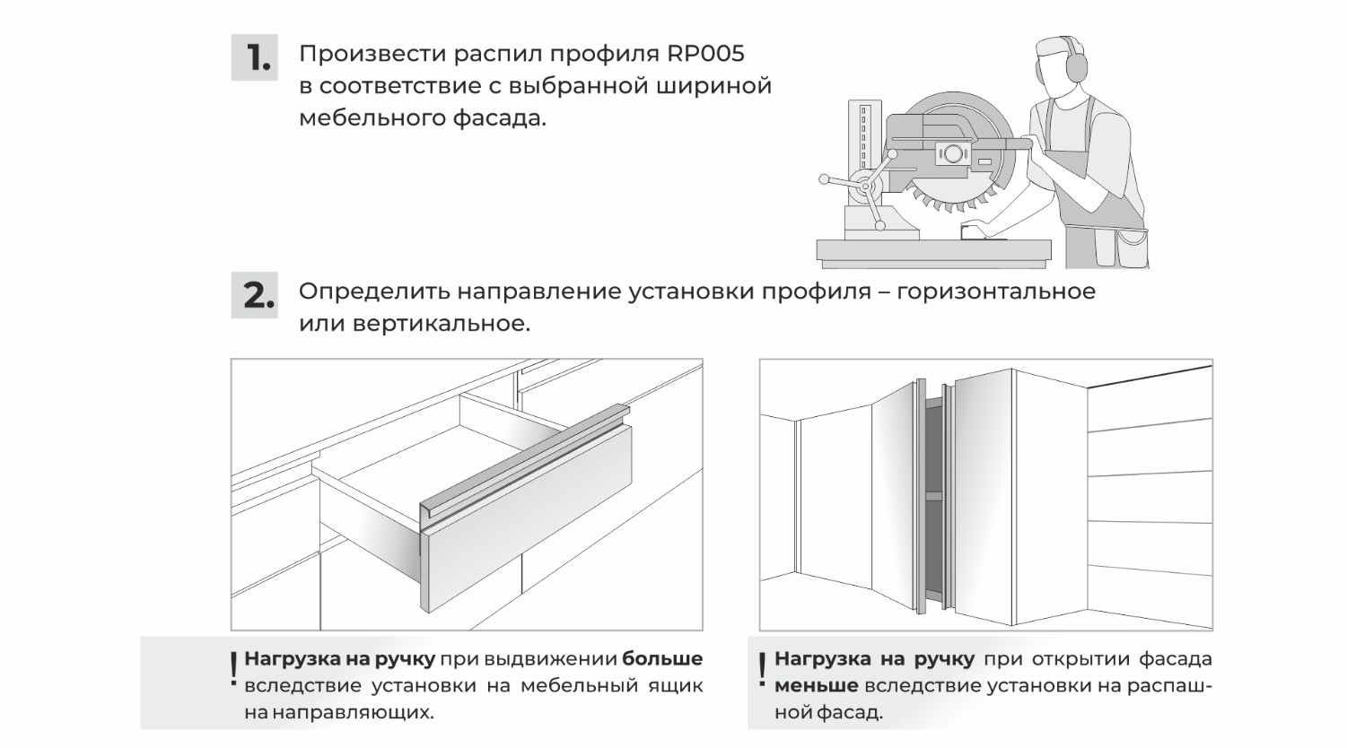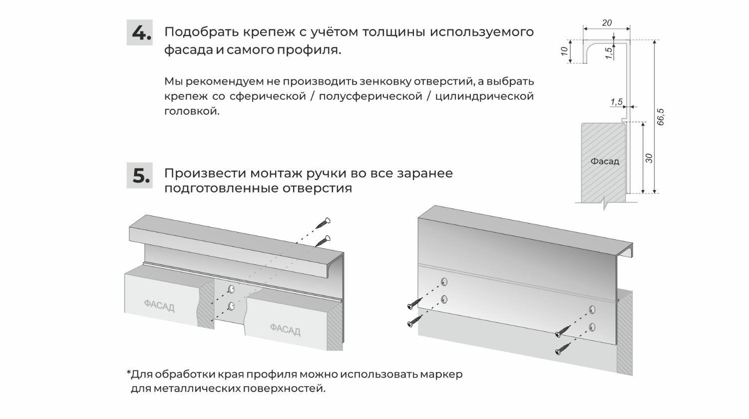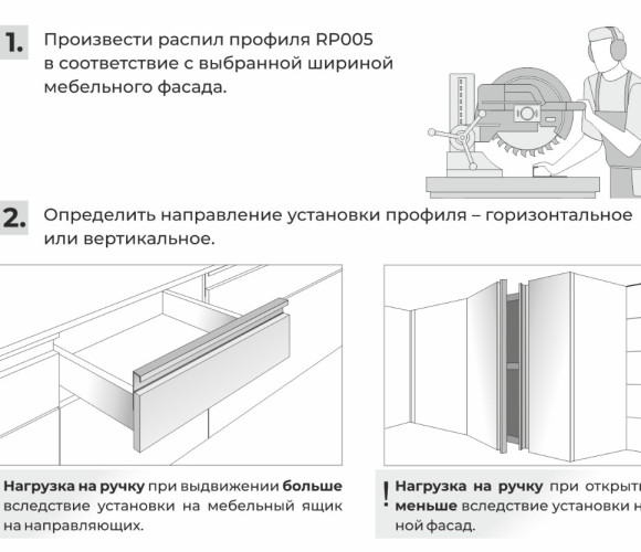 Монтаж ручки не требует дополнительной фрезеровки, профиль накладывается на фасад и закрепляется саморезами с задней стороны. Быстро и просто! Подходит для фасадов любой толщины.