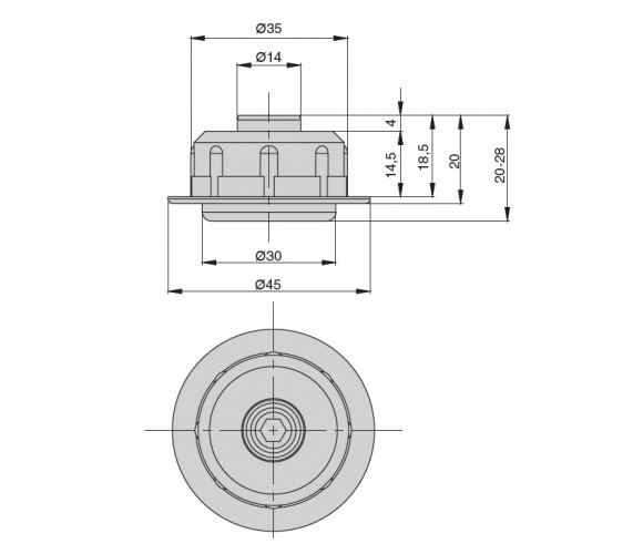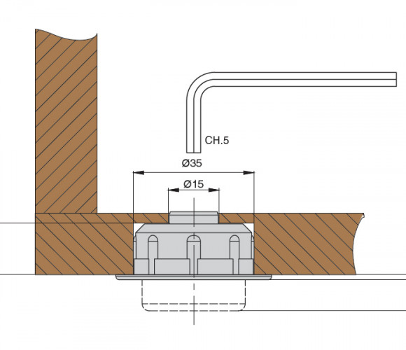 Регулируемая ножка врезная диаметром 35 мм. Отличительной особенность данной ножки является диаметр врезки, равный 35 мм. Врезная ножка устанавливается в ДСП толщиной от 18 мм и выше. Максимальная нагрузка на 4 ножки – 250 кг. Удобство данной модели состоит также в возможности регулировки по высоте.