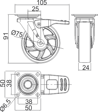 Опора колесная с фланцем, D75мм c тормозом, прозрачное CS-75-B