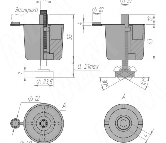 регулировка высоты осуществляется через сквозное отверстие в дне конструкции;