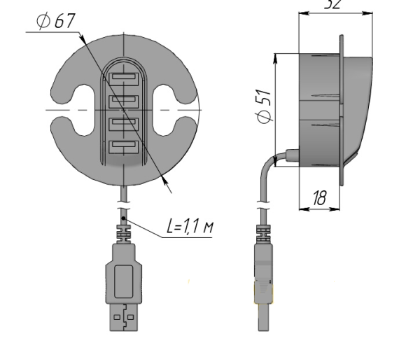 Разветвитель для USB на 4 порта серебро - удобное устройство на работе и в быту, когда вам необходимо одновременно подключить несколько приборов с USB-штекерами. Разветвитель имеет 4 входа USB и устанавливается в столешницу, в предварительно сделанное отверстие соответствующего диаметра. Конструкция предусматривает проёмы в корпусе, позволяющие использовать разветвитель как заглушку кабель-канала.