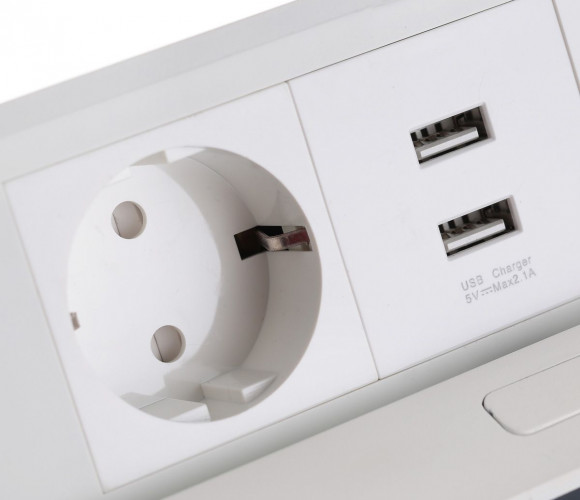 Удлинитель настольный SOFT 2 розетки AE-PBSUC2GS-10 (Schuko) 2xUSB, белый, с проводом 1,5 метра - полезный функциональный элемент интерьера вашего офиса или комнаты. Устройство устанавливается в столешницу и в «спящем» состоянии скрыто от ваших глаз. Как только потребуется розетка, вы легким нажатием откроете рабочую зону удлинителя и подключите компьютер, телефон, светильник или иной гаджет к электросети.