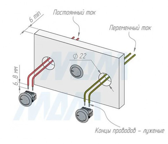 Установка и подключения: подготовить установочное отверстие ∅22 мм; зафиксировать провода в пружинных терминалах.
