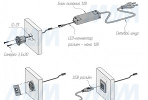 Разветвитель на 3 розетки, разъем LED, DISTR-LED1M3F