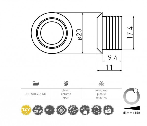 Максимальная мощность осветительного прибора (светильник, LED-лента), на которую рассчитан выключатель - 20 Вт (W).