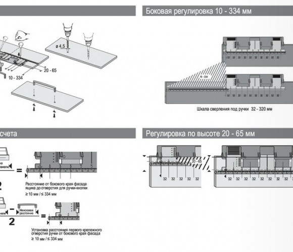 Регулировка расстояния от края передней панели ящика до первого отверстия для монтажа ручки - 10-334 мм