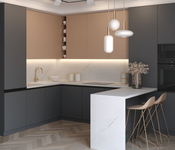 Его универсальность позволяет находить великолепные сочетания как с темными, так и со светлыми оттенками в интерьере.. Спокойный характер декора и его лаконичность наполнят вашу кухню свежим дыханием.