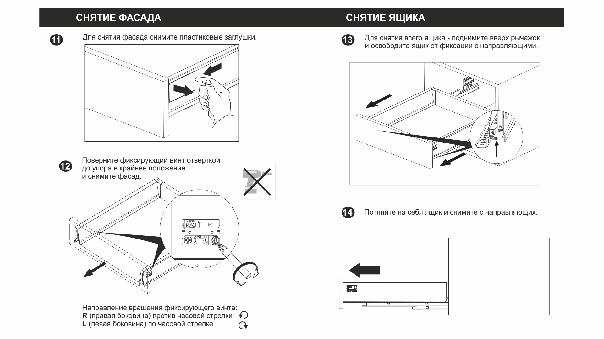 Для срабатывания механизма PUSH в любой точке фасада на широких ящиках (от 600 мм) рекомендуется устанавливать поворотную синхронизирующую трубку SBS10/1500 (приобретается отдельно).