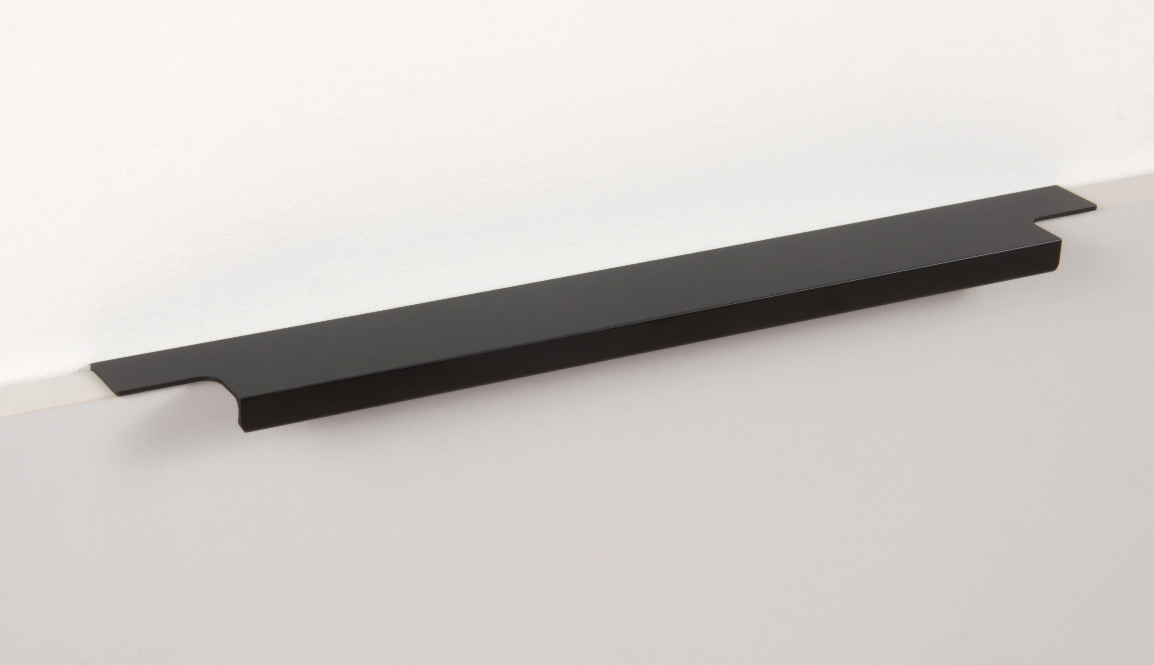 Торцевая ручка для современной мебели. Благодаря лаконичному дизайну и чётким линиям модель будет удобна в использовании и подойдёт для многочисленных стилевых направлений, таких как лофт, модерн, минимализм, pro-line и contemporary. Устанавливается на фасады толщиной до 18 мм и крепится накладным способом двумя вариантами — «в размер» фасада или по центру широких фасадов (как большой «язычок»).